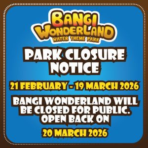 Please be informed that Bangi Wonderland Water Theme Park will be closed from 21 FEBRUARY 2026(Saturday) until 19 MARCH 2026(Thursday) for yearly maintenance. Park will resume operation as usual on 20 MARCH 2026.